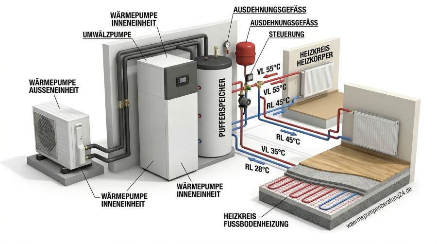 - 🔄 Hydraulische Entkopplung von Wärmepumpe und Heizkreisen